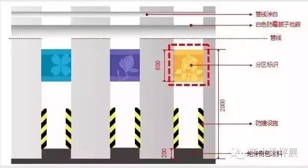 设计要求:地下空间超过3万方的园区,必须设置分区标识,以三个防火分区共用一分区标识。分区标识可结合地面、墙面、柱等明显突出位置进行设置。分区形式可采用色彩分区、形象分区、文字分区等。